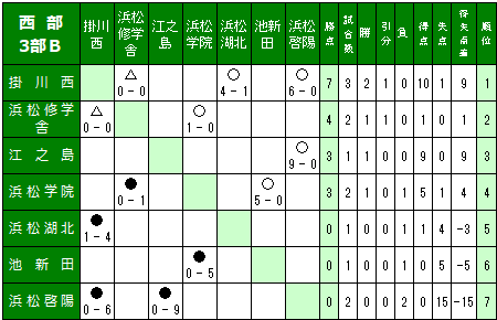 (下段より、試合結果情報をお寄せください。リーグ表に反映いたします。) (下段より、試合結果情報をお寄せください。リーグ表に反映いたします。) リーグ表は随時更新していますので最新版は、プラウザの更新ボタンまたはキーボードのCtrl+F5を押下するなどしてご確認ください。 (下段より、試合結果情報をお寄せください。リーグ表に反映いたします。) 2020 U-18サッカーリーグINDEX プレミア EAST プレミア WEST プリンス東海 県リーグA 県リーグB 県リーグC 東部地区A 東部地区B 東部地区C1 東部地区C2 中部地区1部 中部地区2部 中部地区3部 西部地区1部 西部地区2部 西部地区3部A 西部地区3部B 西部地区2部 過去サイト 2015 2016 2017 2018 2019 ◇静岡県高校サッカー西部地区リーグの結果を送信ください。 記入例 A 富士山 3-3 琵琶湖 ◇ おなまえ メールアドレス(任意) 試合結果(所属リーグ名(1部、2部、3部A,B)の記載をお願いします。)