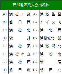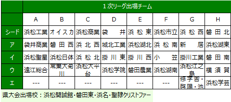 | 6 参加校 38校(34チーム) 浜松開誠館、磐田東、浜名、聖隷クリストファーは県大会からの出場 |